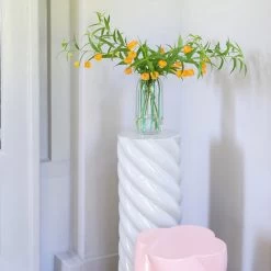 Der Tisch in einem gezwirbeltem Design besteht aus robustem Glasfasermaterial, das ihm eine hohe Stabilität und Langlebigkeit verleiht. Er kann problemlos bis zu 15 kg tragen und bietet somit ausreichend Platz für deine Lieblingspflanzen oder andere Dekorationen.
