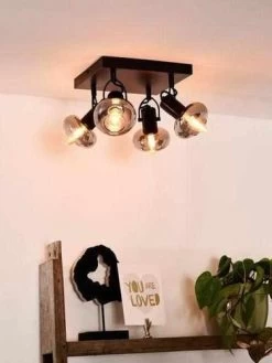 Die Leuchte ist mit vier E-27 Fassungen ausgestattet und kann dadurch mit den Leuchtmitteln Ihrer Wahl ausgestattet werden. Die maximale Leistung beträgt hierbei 25 Watt bei einer Schutzklasse von IP20. Durch die Maße von 23 cm Länge und 9 cm Breite sowie 18 cm Höhe gehört sie zur mittleren Kategorie. Mit einem Gewicht von knapp einem Kilo kann die Leuchte einfach platziert werden. Ihr Metalllook gepaart mit großen Glühbirnen passt zum Retro Look oder dem Industrial Design.