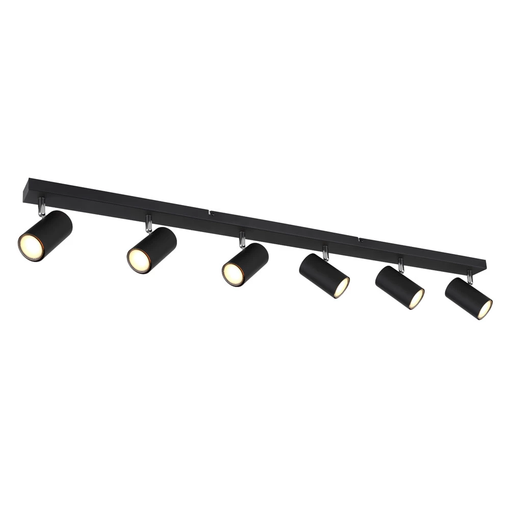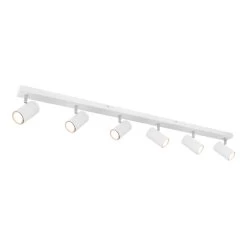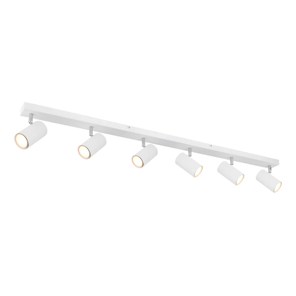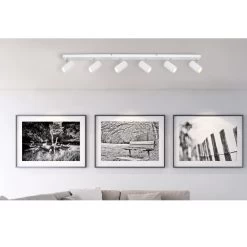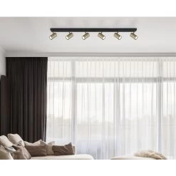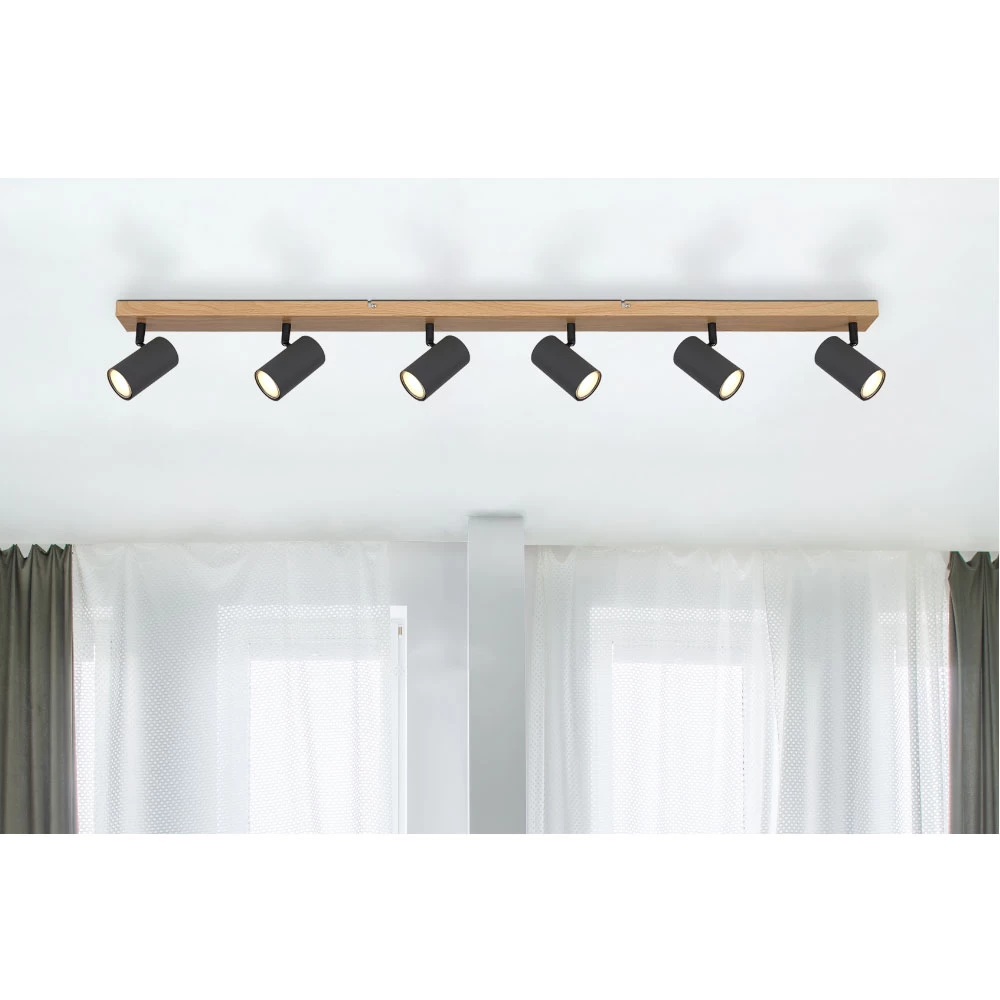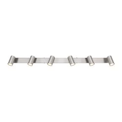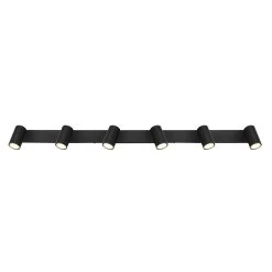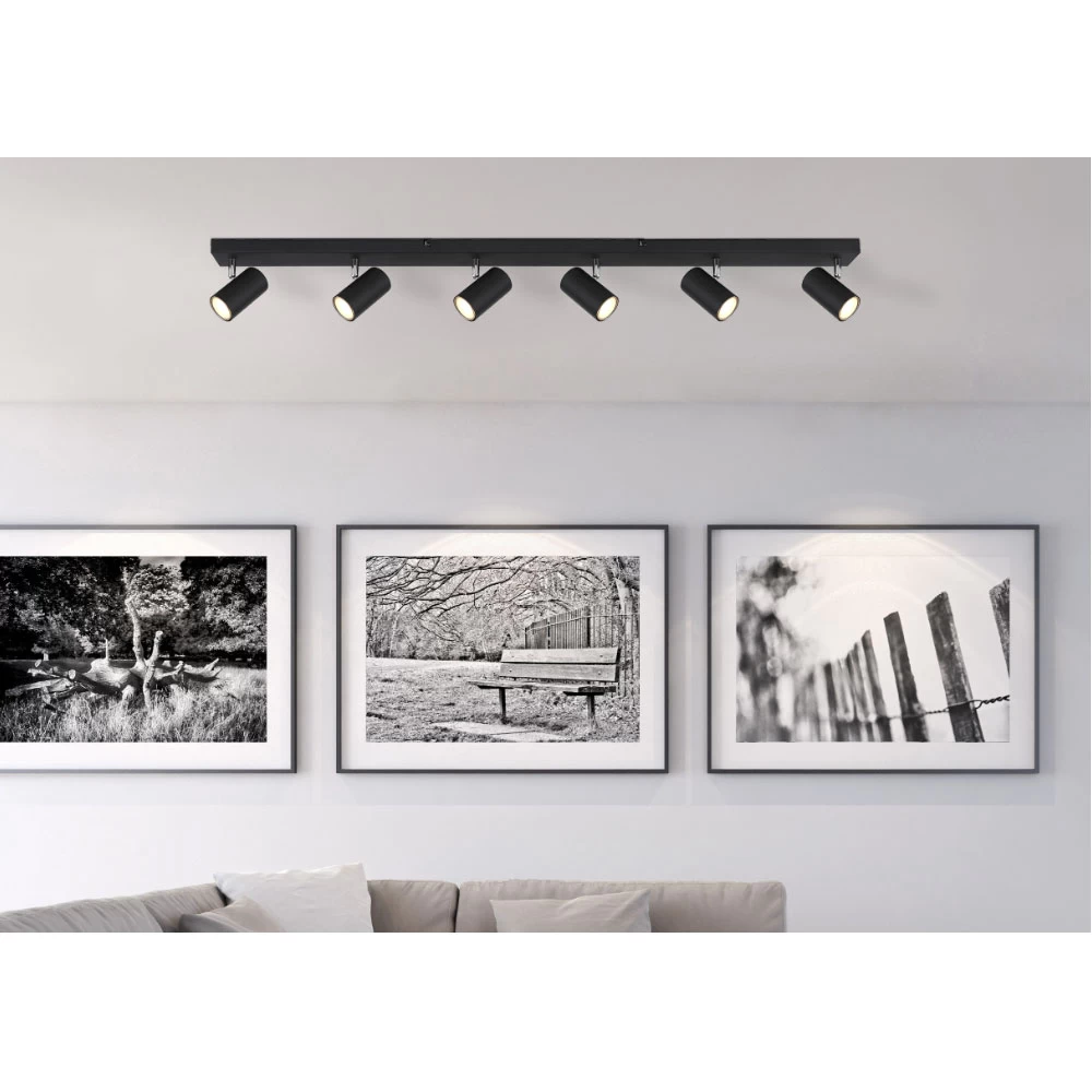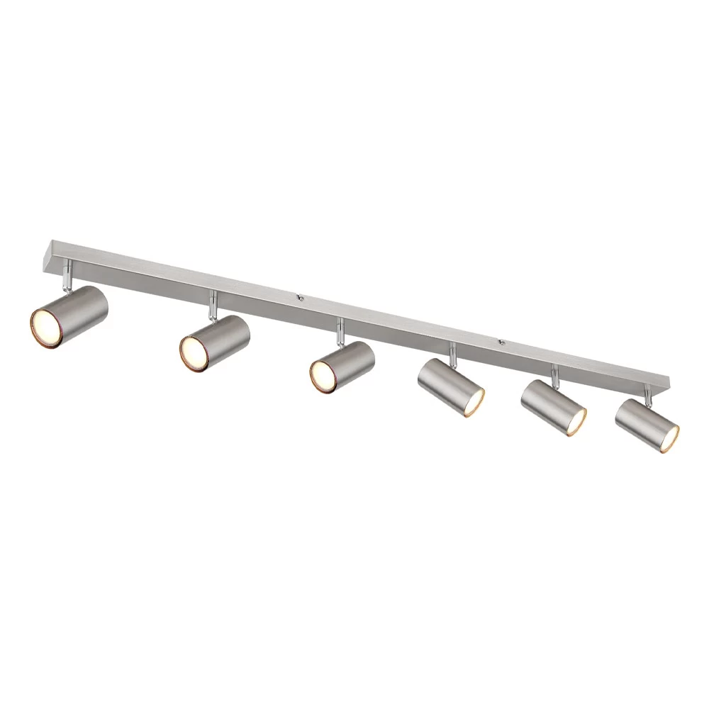 An einer rechteckigen Deckenhalterung (115 x 6cm) befinden sich sechs GU10 Fassungen, die jeweils von einem zylinderförmigen Schirm bedeckt sind. Du hast die Freiheit, deine Leuchtmittel in den GU10 Fassungen selbst auszuwählen und kannst Leuchtmittel mit einer maximalen Leistung von 35 Watt verwenden.