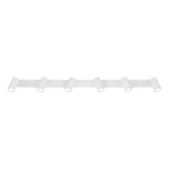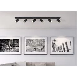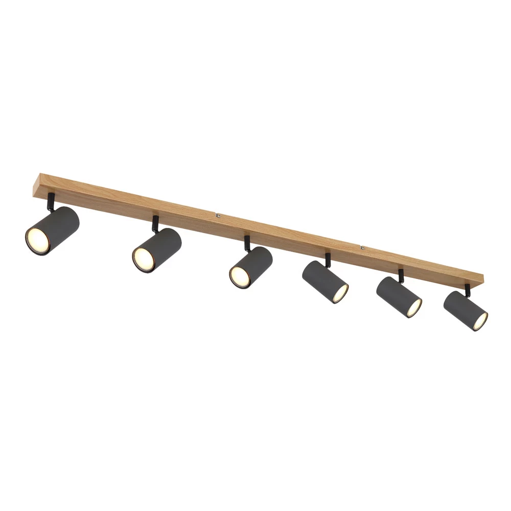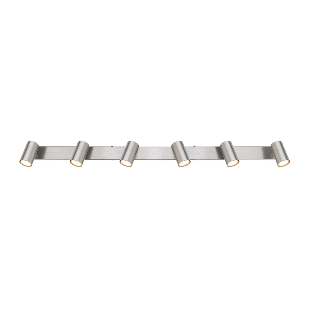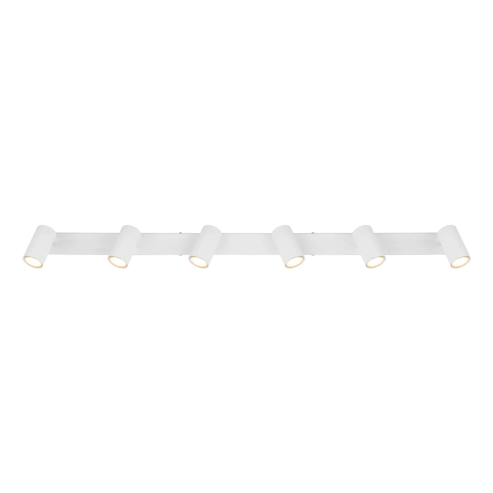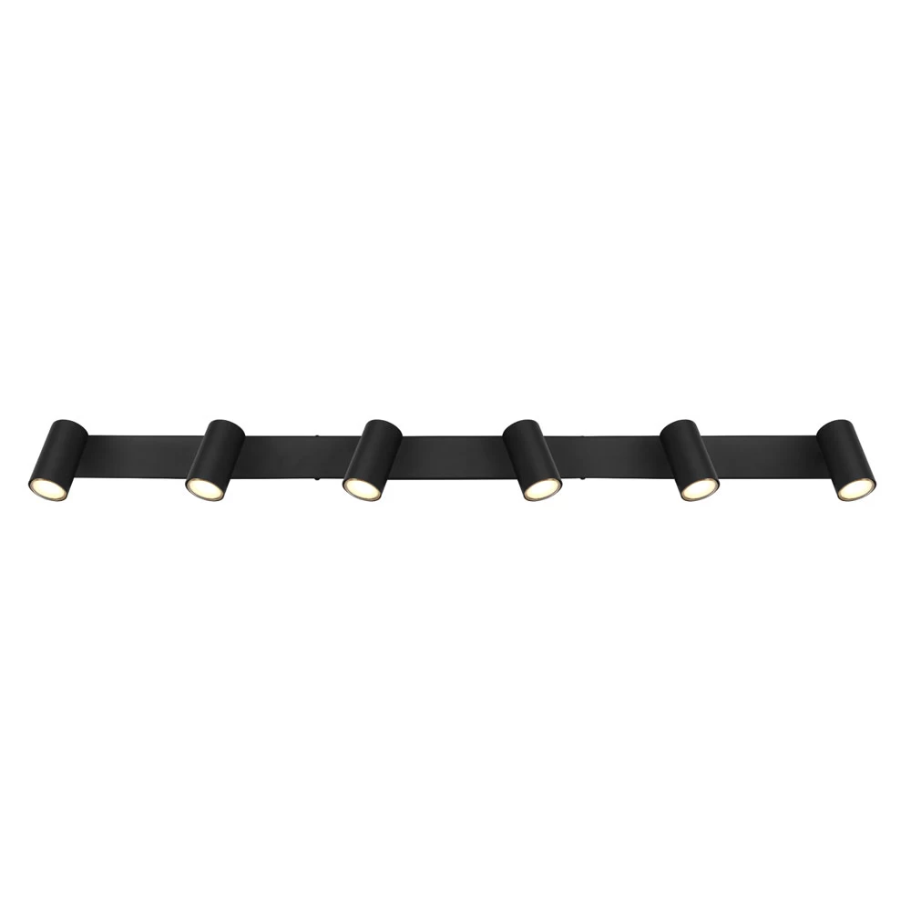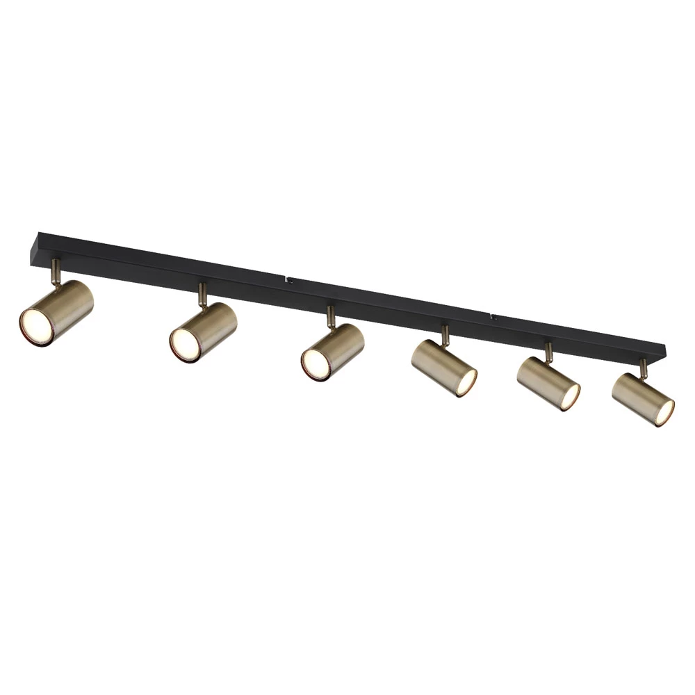 An einer rechteckigen Deckenhalterung (115 x 6cm) befinden sich sechs GU10 Fassungen, die jeweils von einem zylinderförmigen Schirm bedeckt sind. Du hast die Freiheit, deine Leuchtmittel in den GU10 Fassungen selbst auszuwählen und kannst Leuchtmittel mit einer maximalen Leistung von 35 Watt verwenden.