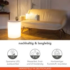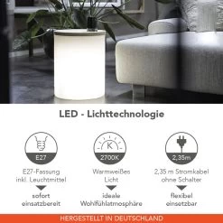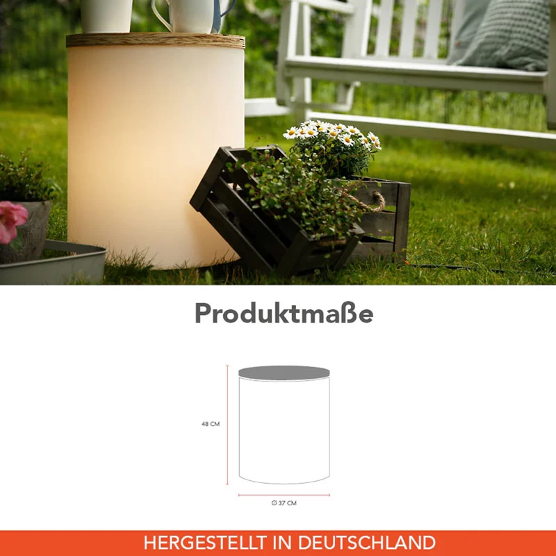 Der Leuchttisch ist standardmäßig mit einer E27 Fassung inklusive warmweißem Leuchtmittel ausgestattet. Dadurch sorgt er nicht nur für eine angenehme Beleuchtung, sondern ist auch ein Blickfang bei Nacht. Dank der Herstellung aus wetterfestem Polyethylen ist der Shining Drum besonders robust gegen Sonne, Regenwetter und Frost. Du kannst ihn also bedenkenlos im Freien verwenden, ohne dir Sorgen um seine Belastbarkeit machen zu müssen.