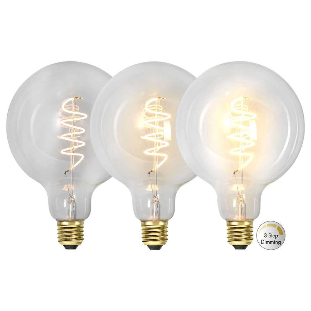 Leuchtmittel mit 3-stufiger Klick-Dimmung und Memory-Funktion! Die Lichtleistung lässt sich einfach per Klick auf den Lichtschalter verändern, 68lm, 135lm eller 270lm. Die Farbtemperatur beträgt 2100K und sie hat eine E27 Fassung. Beginnend mit den zuletzt verwendeten Lumen.