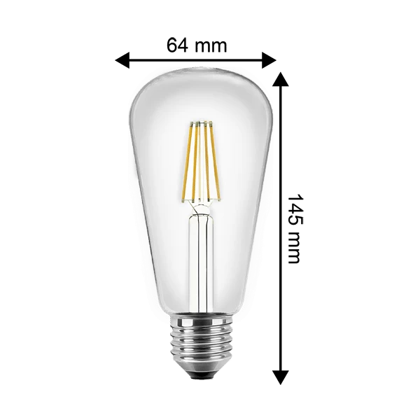 Diese LED Filament Glühfaden Edison Birne ST64 ist ausgestattet mit 4 Watt und erstrahlt im warmweißen Licht. Dieses Licht verteilt sich gleichmäßig über die Glasabdeckung und sorgt für eine homogene Ausleuchtung. Desweiteren ist die LED-betriebene Edison Birne ST64 mit einem handelsüblichen E27 Sockel bestückt, der einen 1 zu 1 Austausch mit herkömmlichen Glühbirnen ermöglicht. Die lange Lebensdauer und eine sehr hohe Schaltfestigkeit bescheren der LED Filament Glühfaden Edison Birne 4 Watt das Energieeffizienzklasse-Label A++.