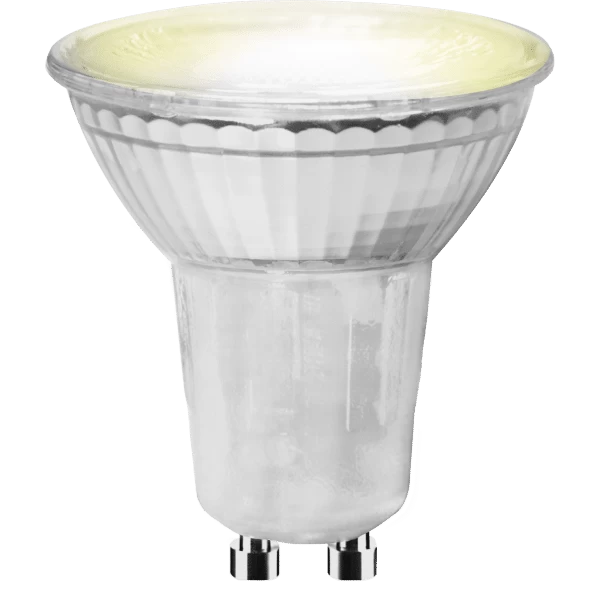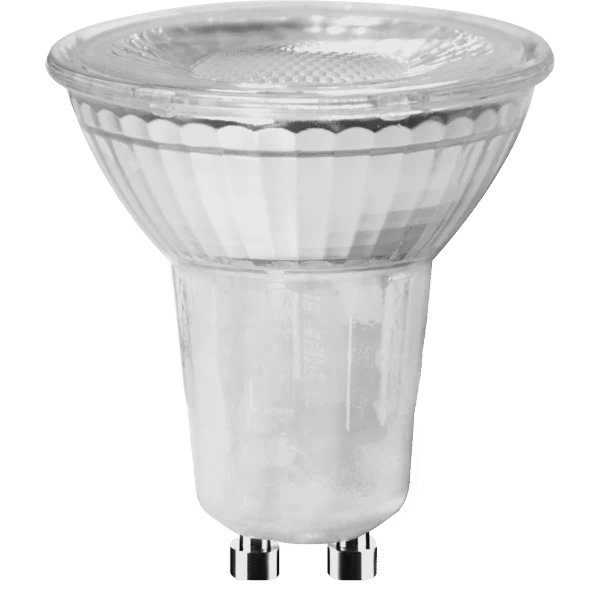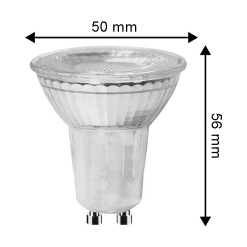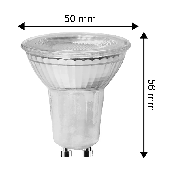 Dieser LED Strahler GU10 kommt im gläsernen Gehäuse und erstrahlt im warmweißen Licht. Dieses Licht wird über eine klare Streuscheibe verteilt, was einen „Spotlight-artigen„ Effekt erzeugt. Darüber hinaus, ist das Leuchtmittel dimmbar und ersetzt herkömmliche 50 Watt Halogenstrahler.