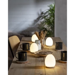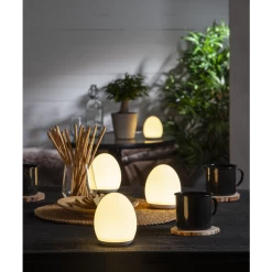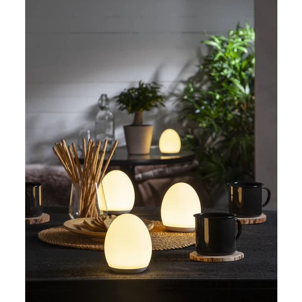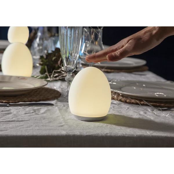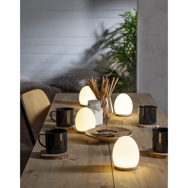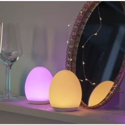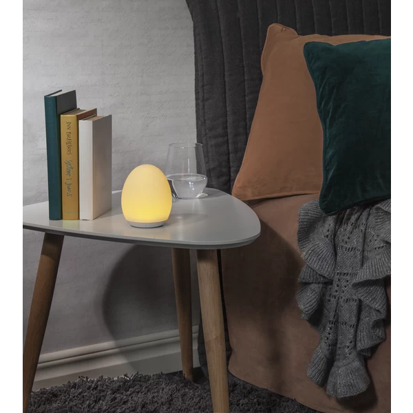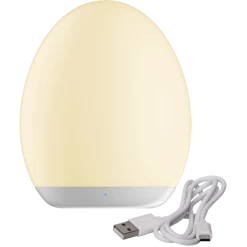 Nicht nur auf dem Nachttisch, sondern auch als Dekoration auf Tischen, auf einer Fensterbank, auf einer Ablage im Flur – diese kleine ovale, akkubetriebene Tischleuchte kann vielseitig genutzt werden, denn sie benötigt im Betrieb keine Steckdose. Ein integrierter, per USB-Ladekabel innerhalb von ca. 3 Stunden aufladbarer Akku bringt die LEDs zum Leuchten. Das Schalten und der Wechsel der Lichtfarbe zwischen warmweiß und acht bunten Tönen gelingt, indem der obere Abschnitt nach unten gedrückt wird.