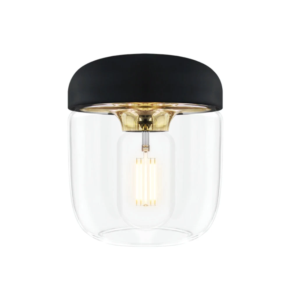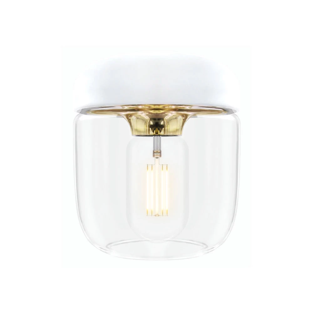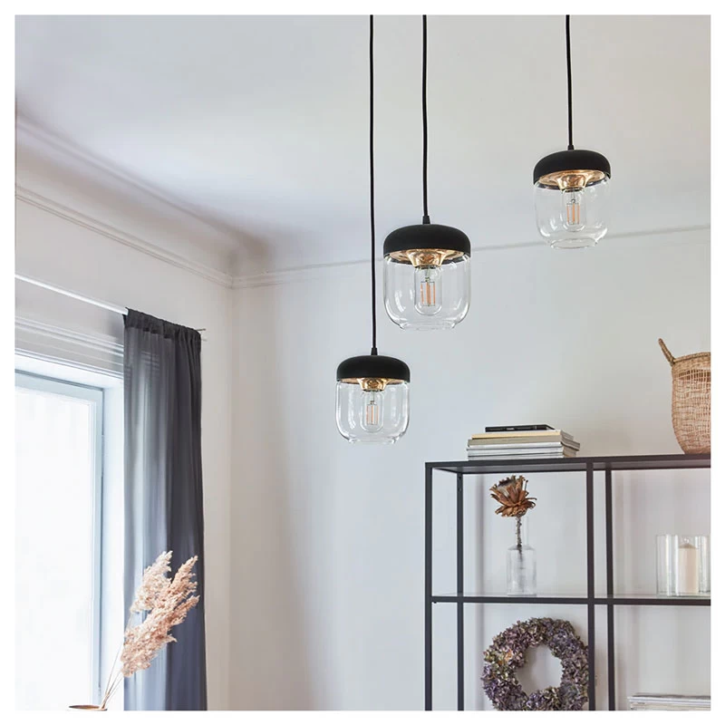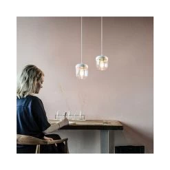 Die Pendelleuchte Acron ist ein künstlerisches Meisterwerk. Durch ihre goldene Fassung strahlt sie ein warmes Licht aus. Das Leuchtmittel inmitten der Glashülle ist variabel und kann je nach Geschmack zusätzlich ausgewählt werden.