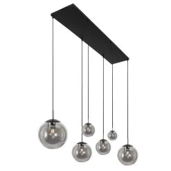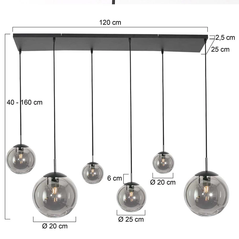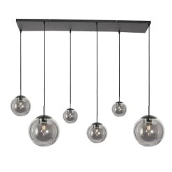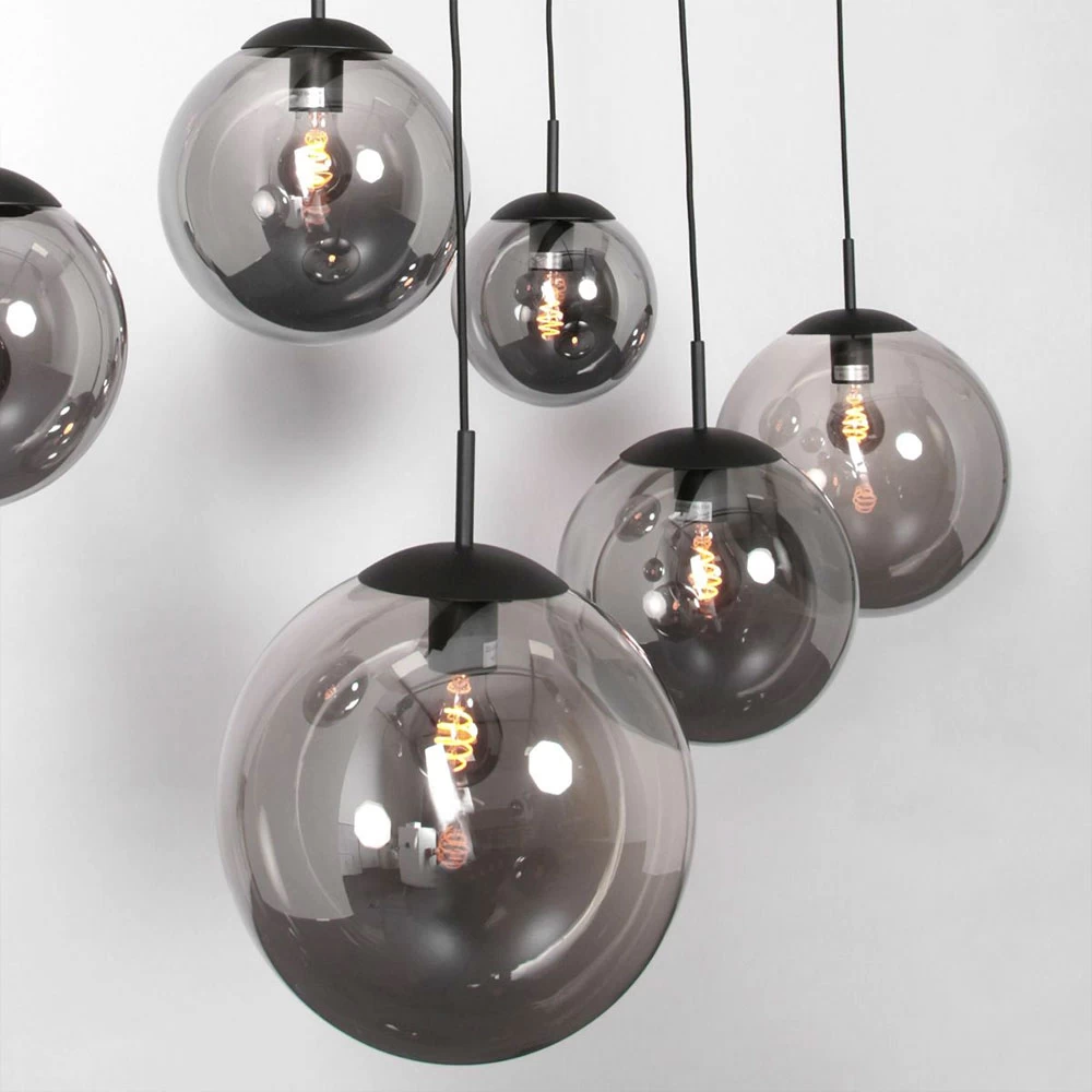 Die Pendelleuchte besteht aus Metall und ihre sechs unterschiedlich großen, kugelförmigen Lampenschirme bestehen aus edlem Glas.