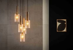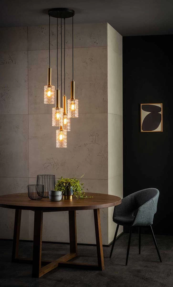 Die Pendelleuchte Crush besticht durch ihre Eleganz, stilvolles Aussehen und einen Mix aus klassischem und modernen Design. Ein wahres Schmuckstück für Ihr Zuhause das mit Sicherheit sofort ins Auge fällt. Die 5 Glasschirme haben einen tollen, klassischen Schliff und sorgen dabei für eine stimmungsvolle, diffuse Beleuchtung. Crush wertet damit jeden Esstisch oder auch einen Treppenaufgang auf.