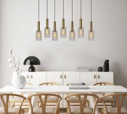 Die 7 E27-Fassungen in Mattgold ergänzen die kunstvollen Gläser. Ein weiteres schönes Detail ist, dass sie die Leuchte ganz nach Ihren Bedürfnissen in der Höhe verstellen können.