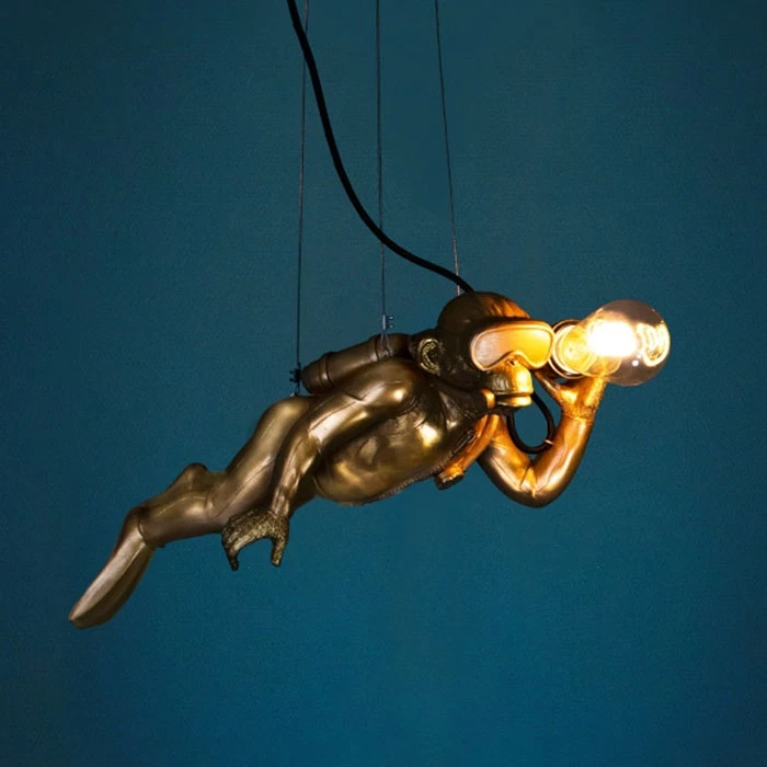 Entdecke unsere faszinierende Pendelleuchte Dive-Monkey – eine wunderschöne goldfarbene Leuchte, die den Eindruck erweckt, als würde ein verspielter Affe im Taucheranzug elegant durch deinen Raum tauchen. Diese einzigartige Leuchte wird sicherlich alle Blicke auf sich ziehen und dich einfach nicht kaltlassen.