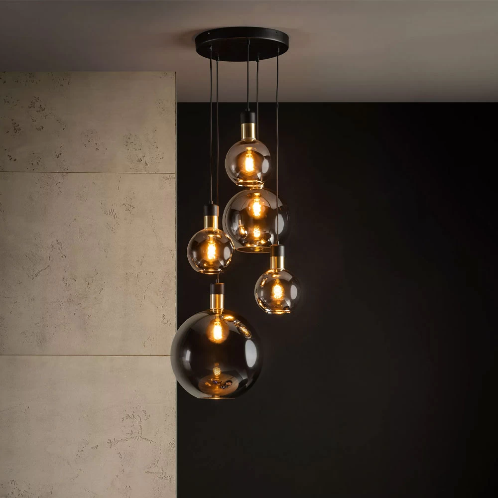 Die Leuchte ist mit fünf E-27 Fassungen ausgestattet und kann dadurch mit den Leuchtmitteln Ihrer Wahl ausgestattet werden. Ihre Höchstleistung beträgt 60 Watt pro Fassung. Durch die Maße von 65 cm Länge, 65 cm Breite und 160 cm Höhe zählt sie zur großen Kategorie. Mit einem Gewicht von knapp zwei Kilo kann die Leuchte einfach an der Decke montiert werden. Durch den schwarz goldenen Metall Look entspricht sie dem Vintage Stil. Wir empfehlen ein Leuchtmittel mit Rauchglas für den perfekten Look.