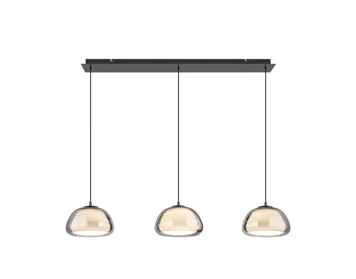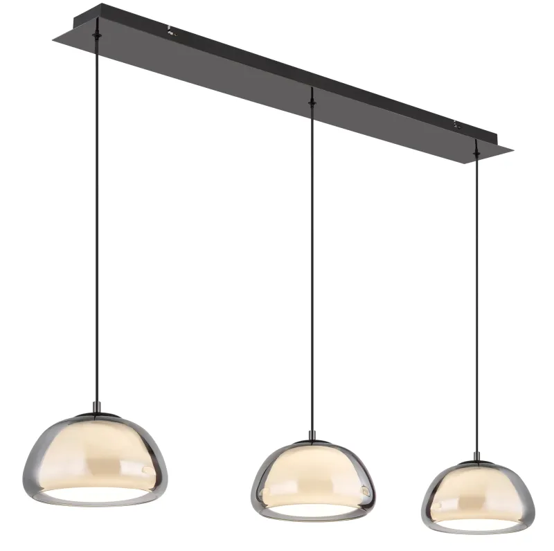 Die Lilly 3er Hängeleuchte setzt stilvolle Akzente und bietet eine ideale Kombination aus modernem Design und vielseitiger Funktionalität. Diese rechteckige Pendelleuchte beeindruckt mit drei hängenden Glaskörpern in einem eleganten rauchfarbenen Finish, ergänzt durch ein opales Innenglas, das eine sanfte Lichtverteilung schafft. Der Korpus aus schwarz-chromfarbenem Metall verleiht der Lilly 3er Leuchte eine zeitgemäße und edle Optik, die perfekt in moderne Wohn- und Essbereiche passt.
