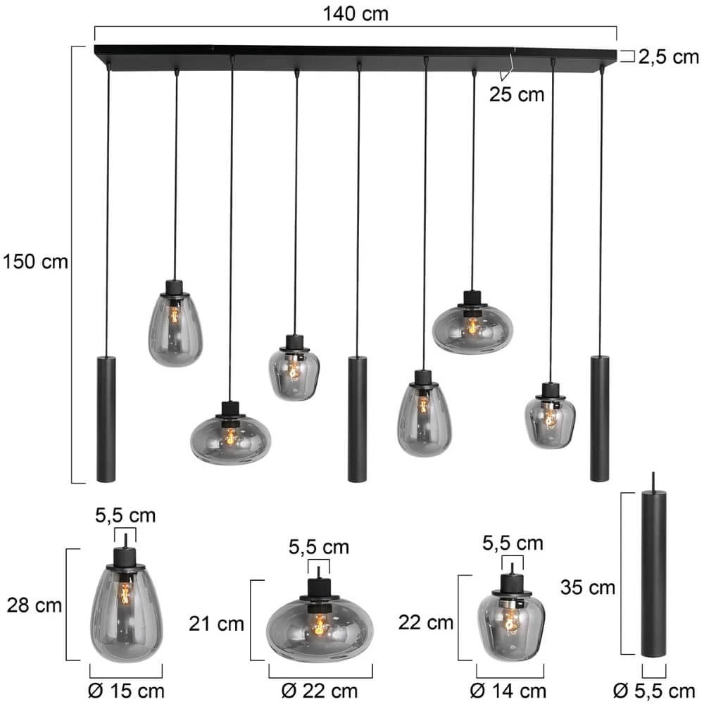 Mit insgesamt 9 Pendeln ist diese Leuchte ein echter Blickfang. Die 6 amberfarbenen Glasschirme mit E27-Fassung erzeugen ein warmes und einladendes Licht, perfekt zum Entspannen oder für gesellige Abende. Die restlichen 3 Röhren mit GU10-Fassung sorgen gezielt für helles Licht auf deinem Tisch, ideal zum Arbeiten oder Essen.