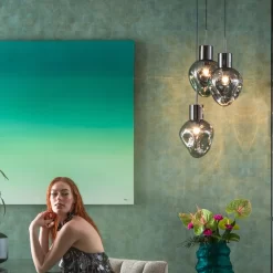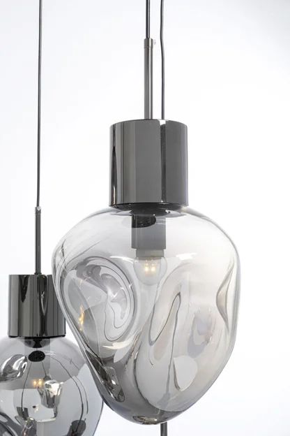 Die höhenverstellbare Pendelleuchte passt sich flexibel Ihrer Einrichtung an und kann von 50 bis 160 cm verstellt werden. Sie eignet sich perfekt für den Einsatz über dem Esstisch oder an anderen Stellen, an denen Sie eine einladende Atmosphäre schaffen möchten. Die silbrig-grauen Lampenfassungen sowie der Decken-Baldachin bestehen aus verchromtem Stahl, was der Leuchte einen edlen Look verleiht.