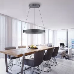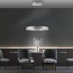 Entdecken Sie die PURE E-Clipse LED Pendelleuchte, die perfekte Symbiose aus modernem Design, höchster Funktionalität und technischer Raffinesse. Mit ihrer eleganten Farbgebung in Bronce, Silber oder Schwarz fügt sich diese Leuchte nahtlos in jeden Wohnraum ein und setzt dabei stilvolle Akzente – perfekt, um Ihren Esstisch in ein zeitgemäßes Highlight zu verwandeln.Per Knopfdruck auf die im Lieferumfang enthaltene Funk-Fernbedienung lässt sich die Höhe der Leuchte elektrisch und mühelos verstellen – ganz ohne manuelles Nachjustieren. Die intuitive Bedienung spart Zeit und bietet maximalen Komfort.Mit der CCT-Farbtemperatursteuerung (2700K – 5000K) passt sich die Pure LED Pendelleuchte perfekt an Ihre Bedürfnisse an. Von warmweißem Licht für eine gemütliche Atmosphäre bis hin zu neutralweißem Licht für konzentriertes Arbeiten – alles ist möglich. Zusätzlich ermöglicht die stufenlose Dimmfunktion die präzise Regulierung der Helligkeit, um jede gewünschte Stimmung zu schaffen.Die handliche, runde Funk-Fernbedienung bietet volle Kontrolle über alle Funktionen – von Farbtemperaturanpassungen bis zur Dimmung – bequem von jedem Punkt im Raum aus. Dank der Memoryfunktion speichert die Leuchte die zuletzt gewählten Einstellungen, sodass Sie immer in Ihrer bevorzugten Lichtumgebung starten.Die Pure LED Pendelleuchte steht für exzellente Verarbeitung und langlebige Materialien. Diese edle Pendelleuchte ist nicht nur in Bronce, sondern auch in Gold und Schwarz erhältlich. So können Sie die Variante wählen, die optimal zu Ihrem Wohnstil passt. Verleihen Sie Ihrem Zuhause mit der Pure LED Pendelleuchte eine einzigartige Kombination aus Design, Funktionalität und smarter Technologie. Jetzt entdecken und den Unterschied erleben!