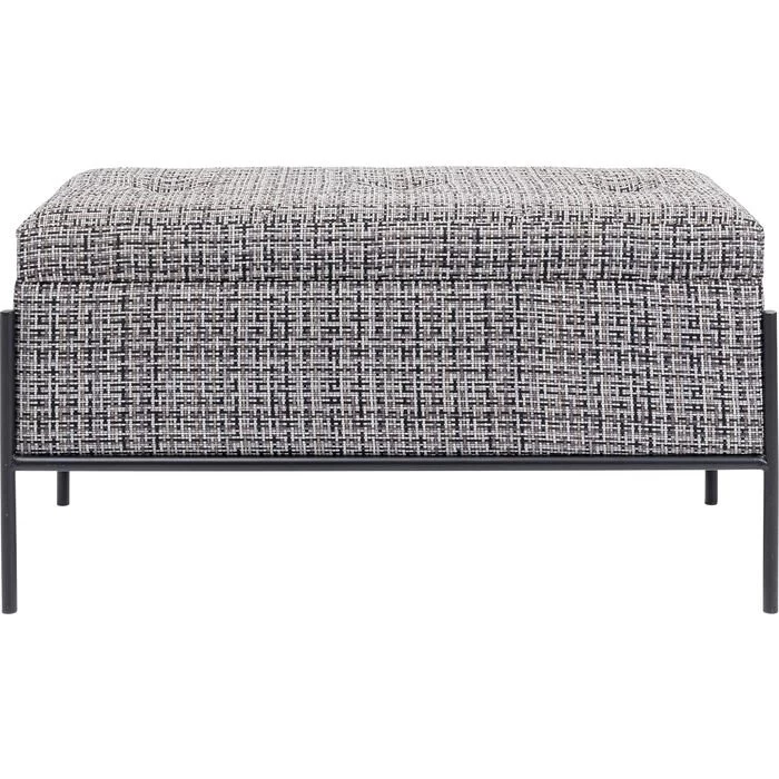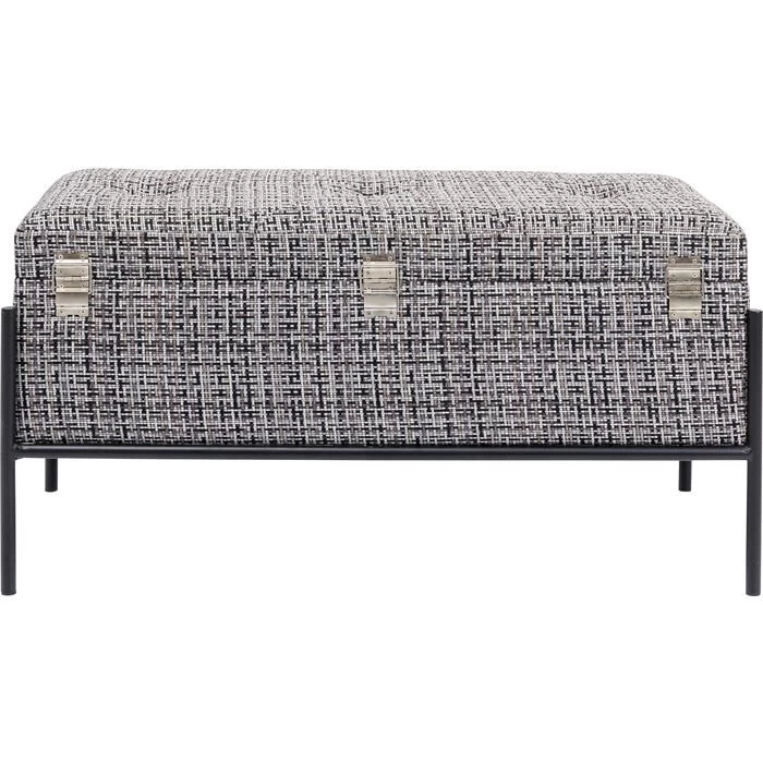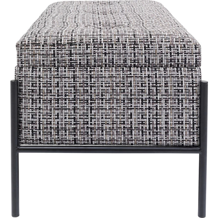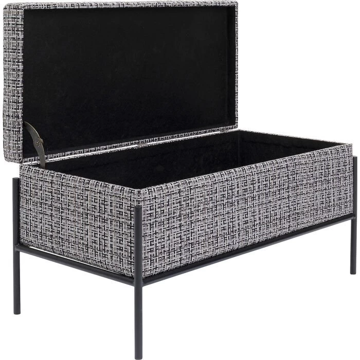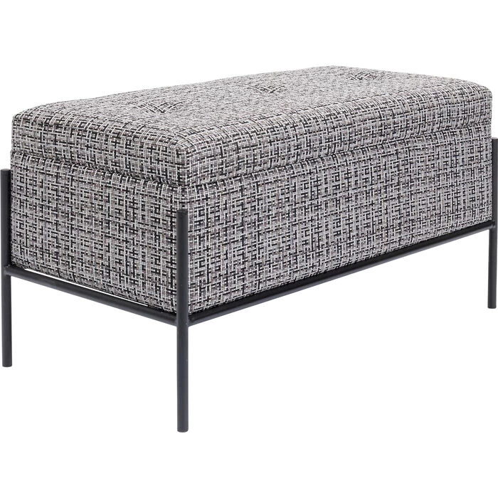 Die moderne Sitzbank mit großem Stauraumfach und bequem gepolsterter Sitzfläche ist ein Hingucker in jedem Zimmer. Die edle Designerbank mit Strukturstoff in schwarz, weiß und grau mit filigranem Stahlgestell ist mit ihren Maßen 43 x 80 x 40 Zentimeter (H/B/T) sehr praktisch und platzsparend. Die Sitzbank Caro löst Einrichtungsprobleme gleich zweifach: als Sitzplatz und Stauraum. Perfekte Staufläche im Flur für Schals, Mützen, Handschuhe oder sogar Einkaufstüten für den nächsten Eikauf. Im Schlafzimmer ans Fußende des Betts gestellt ist die Sitzbank Caro eine sichere Bank für Kopf- und Zierkissen sowie Plaids und Überwürfe. Alles kann super schnell abends verstaut werden und es sieht immer ordentlich aus. Mit ihrem pflegeleichtem Karomuster derzeit sie den ein oder andern Fleck und ist angenehm pflegeleicht.