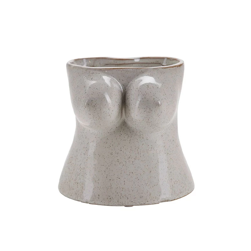 Die Vase Femini ist aus hochwertigem Steingut gefertigt und hat die Form eines weiblichen Oberörpers mit sanften, weiblichen Rundungen. Ihre zarte beige Farbe strahlt Eleganz und Schönheit aus und wird sicherlich alle Blicke auf sich ziehen.