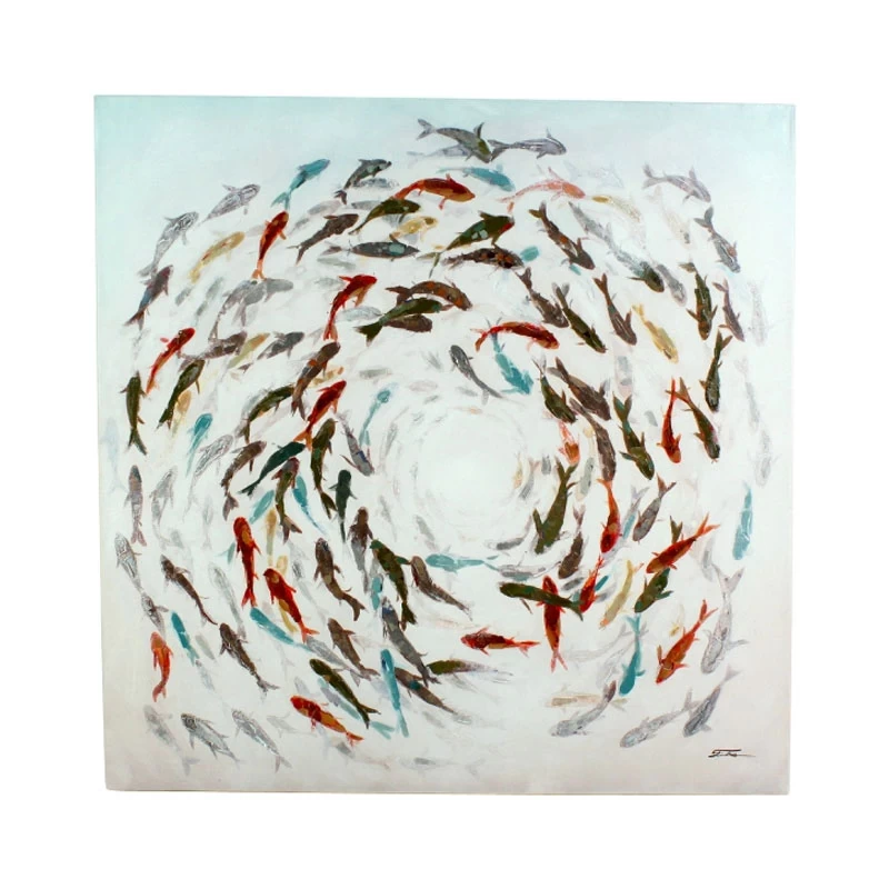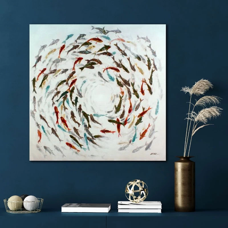Stell dir vor, wie dieses atemberaubende, handgemalte Wandbild dein Zuhause in einen Ozean voller Farben und Leben verwandelt. Unser gerahmtes Wandbild “Fishes” ist ein echtes Meisterwerk der Minimalismus-Kunst und zeigt einen faszinierenden Fischschwarm aus der Vogelperspektive.
