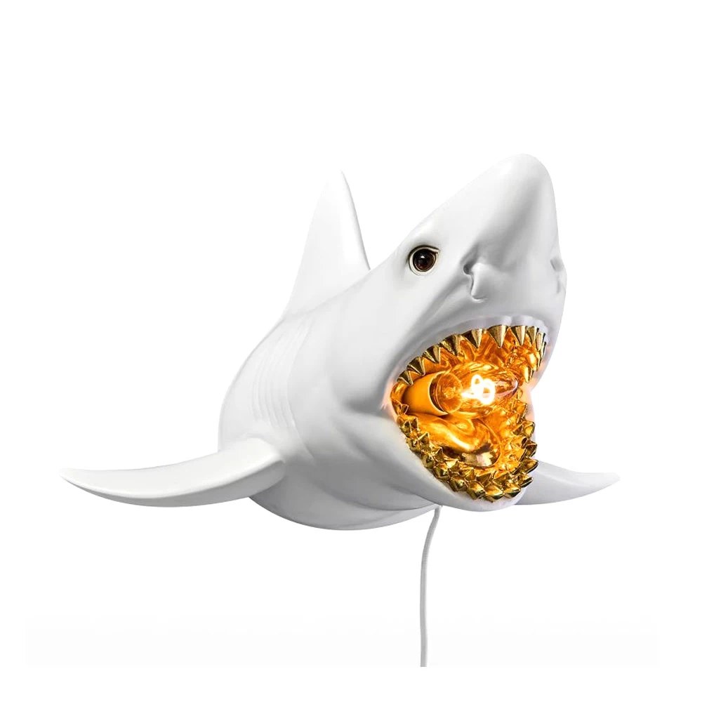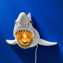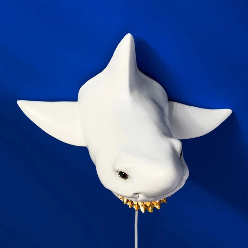 Diese einzigartige Leuchte ist nicht nur eine Lichtquelle, sondern auch eine faszinierende Skulptur. Der weiße Hai, halb aus der Wand ragend, zeigt stolz sein weit aufgerissenes, goldschimmerndes Maul, das von funkelnden goldenen Zähnen geziert wird. Und weißt du, wo sich das Leuchtmittel versteckt? Genau, im Maul des Hais! Das ist ein wahrhaftiger Blickfang.