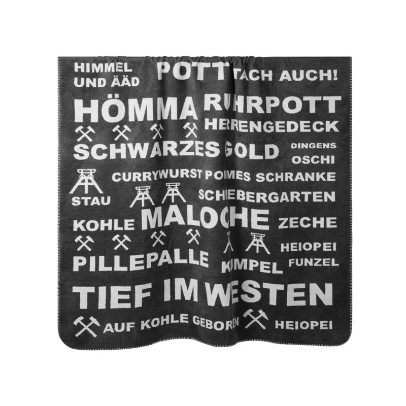 Die Wohndecke Ruhrpott ist in einem eleganten, dunkelgrauen Unifarben-Design gehalten und verziert mit bekannten SprĂĽchen und BegrĂĽĂźungen, die jeder Ruhrpottler sofort erkennt. Sie ist nicht nur ein StĂĽck Stoff, sondern ein StĂĽck Heimat, das du immer bei dir haben kannst.